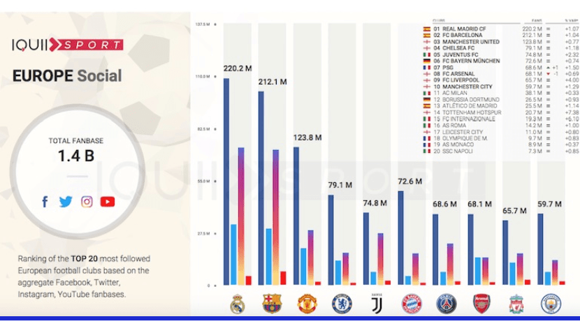 Iquii, site spécialisé dans le marketing sportif, a publié une étude montrant les 20 clubs européens les plus suivis sur les différents réseaux sociaux. On retrouve au 2 premières places les 2 principaux clubs espagnols, avec le club de la capitale le Real Madrid en 1ère place avec 220,2M de followers sur les différentes plateformes devant le club catalan du FC Barcelone qui est suivi par 212,1 M de personnes. Pour compléter le podium on retrouve Manchester United qui se retrouve assez loin derrière les 2 géants espagnols avec 123,8 M de followers.