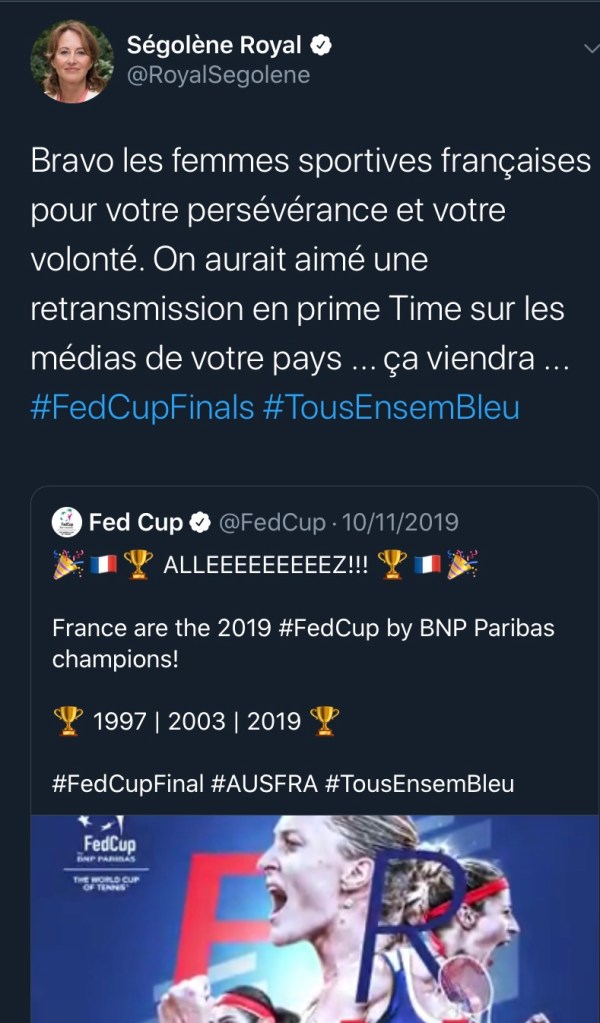 Ségolène Royal membre du parti socialiste a critiqué la finale de la Fed Cup. Lors de cette finale remportée par la France, la politicienne a publiquement exprimé son regret du manque de médiatisation du sport féminin. Si la cause est bonne, la forme l’est moins puisqu’elle n’avait pas l’air au courant que la finale se déroulait en Australie, avec 7h de décalage horaire. Difficile donc de diffuser en direct un match en prime-time (21h) quand celui-ci se déroule… à 4h du matin. Faire de la récupération politique sur un sujet qu’on ne maîtrise pas n’est en général pas une bonne idée…