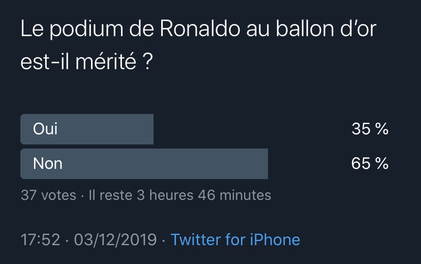 Les internautes ont eu un avis très mitigé par rapport à la victoire de Messi. Un internaute nous a indiqué que selon lui le titre est mérité car le joueur catalan a encore eu des stats très impressionnantes cette saison malgré qu’il n’ait pas gagné de grands titres européens cette. Le second sondage concerne le podium de Cristiano RONALDO qui a beaucoup fait polémique