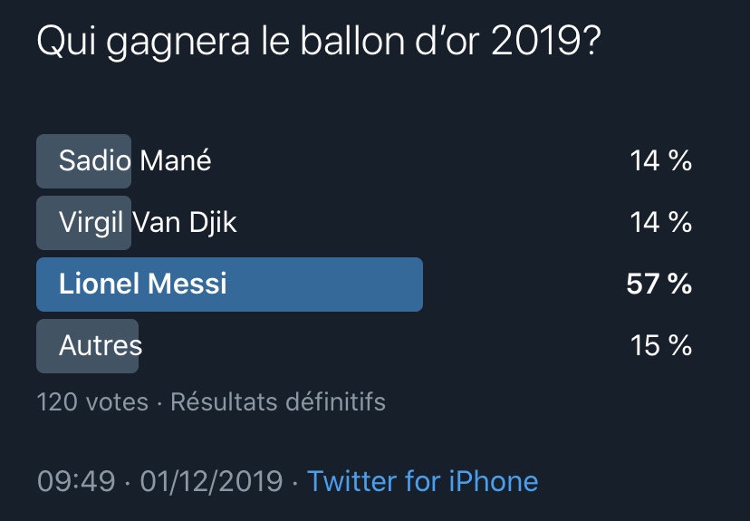Nous avons réalisé un sondage sur le réseau social twitter pour savoir selon les internautes qui devrait gagner le ballon d’or 2019. Le sondage a révélé que Messi était le grand favori largement devant les autres « grands » candidats. Il devance la catégorie « Autres ». Les membres de la Twittosphère nous ont indiqués qu’il mettrait Ronaldo ou encore l’Egyptien Salah. Ils n’ont pas su départager le Sénégalais Sadio Mané du défenseur Hollandais Virgil Van Djik qui ont reçu chacun 14% des votes.