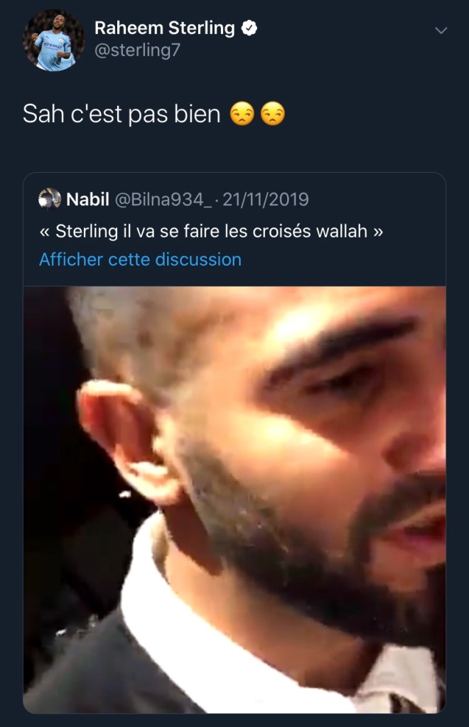un fan de Riyad Mahrez espérait dans une vidéo que Sterling se blesse pour donner plus de temps de jeu à l’algérien, le principal concerné a réagi. Très actif sur Twitter, l’ailier des Citizens s’est fendu d’une série de tweets en français, dont certains à la gloire des rappeurs Jul et PNL. Certains twittos se sont alors doutés d’une probable influence de son coéquipier Benjamin Mendy. Le latéral français s’est en tout cas dédouané de toute responsabilité.